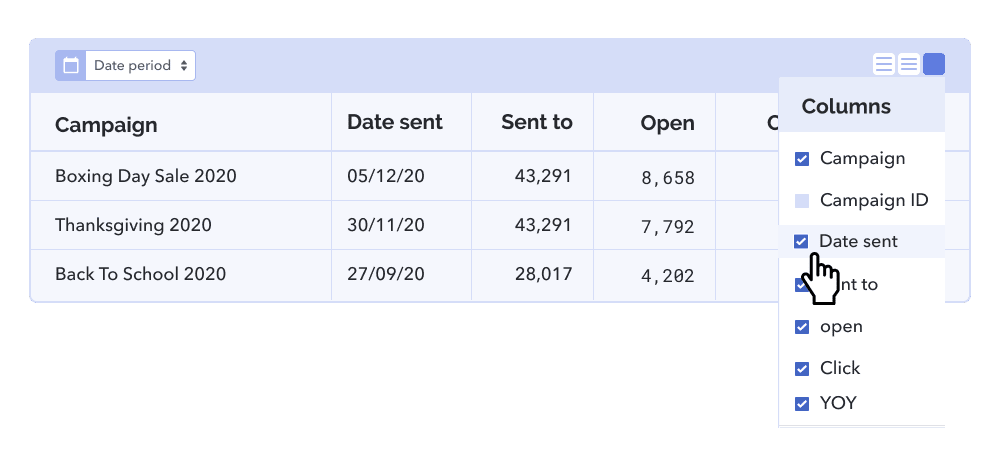 Oferecer aos usuários a opção de adicionar ou remover colunas é uma opção de visualização explícita que permite aos usuários um maior grau de controle sobre sua experiência de visualização de tabelas. À medida que os usuários analisam as informações, seus casos de uso podem mudar e o contexto é importante. Para acomodar essa realidade, esse recurso superflexível é útil. Observação: você pode tornar o recurso completamente flexível (tudo pode ser removido ou adicionado, ou você pode restringir a remoção de algumas coisas), desde que haja uma funcionalidade de 'redefinição' proeminente onde os usuários possam reverter o que fizeram. Leve isso em consideração e a experiência do usuário da sua tabela de dados prosperará!